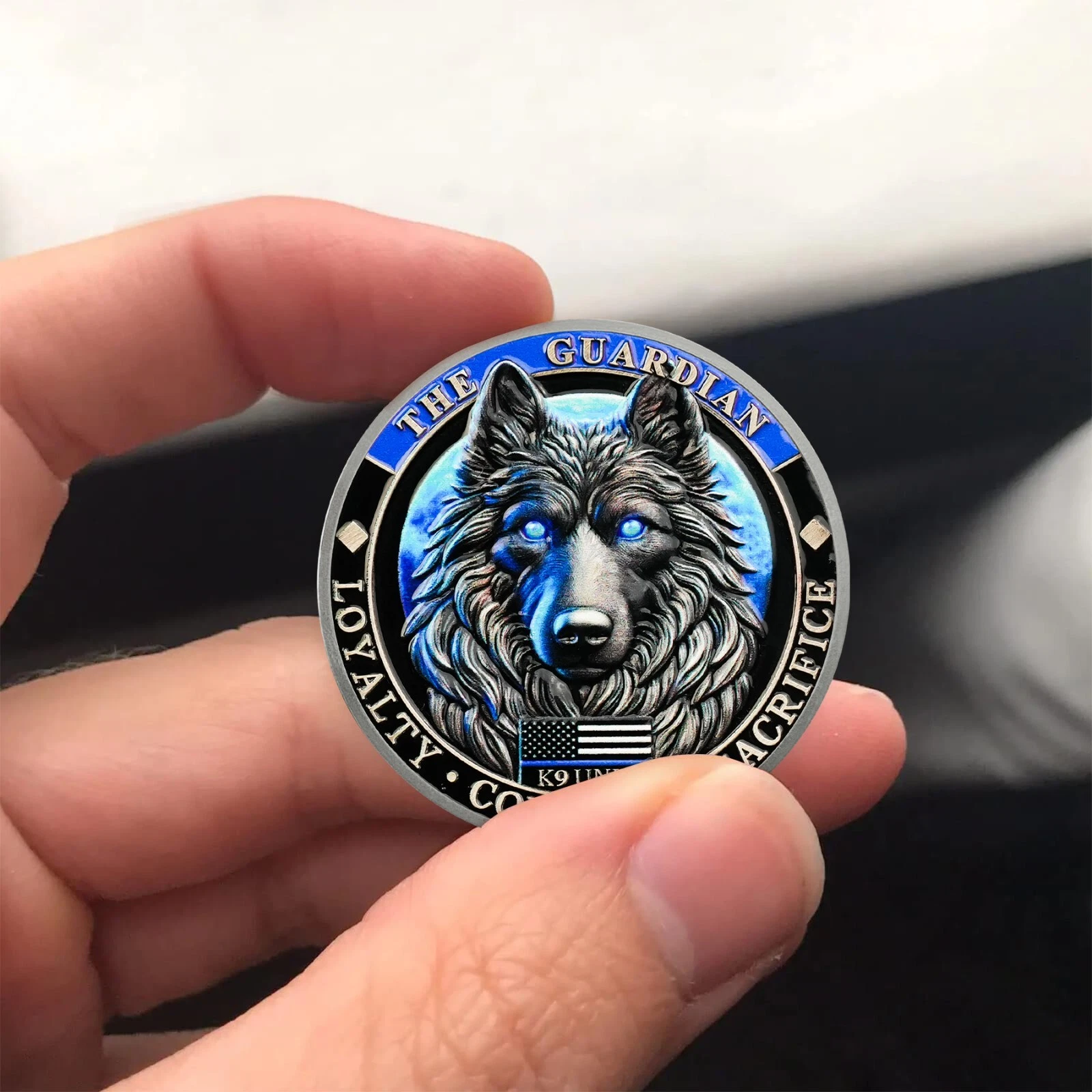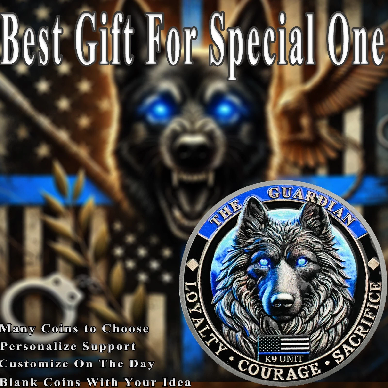 One side features a fierce wolf with glowing blue eyes, standing as a symbol of loyalty, courage, and determination. With the American flag in the background and the words “LOYALTY, COURAGE, SACRIFICE”, it pays tribute to the values embodied by every K9 officer. 🇺🇸